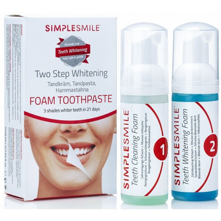 „Simplesmile® Dual Foam“ yra dantų balinimo putos, naudojamos kaip dantų pasta. Dantų balinimo procedūros metu „Dual Foam“ putos pakeičia jūsų įprastą dantų pastą. Procedūra susideda iš dviejų žingsnių, kurie valo ir balina dantis, ir yra puiki alternatyva tiems, kurie nenaudoja dantų balinimo gelio ir balinimo kapų. Valykite dantis, kaip įprasta, šiomis putomis tiek ryte, tiek vakare tris savaites, norint pasiekti geriausius rezultatus.