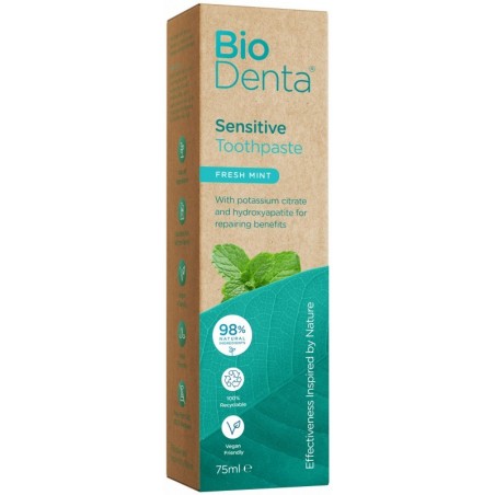 BioDenta „Sensitive Toothpaste“ yra visapusiškos priežiūros dantų pasta, skirta jautriems dantims. Stiprina dantų kietuosius audinius ir sudaro apsauginį sluoksnį ant emalio paviršiaus. Su kalio citratu ir hidroksiapatitu. 98% natūralių ingredientų, be SLS ir PEG, tinka veganams.
