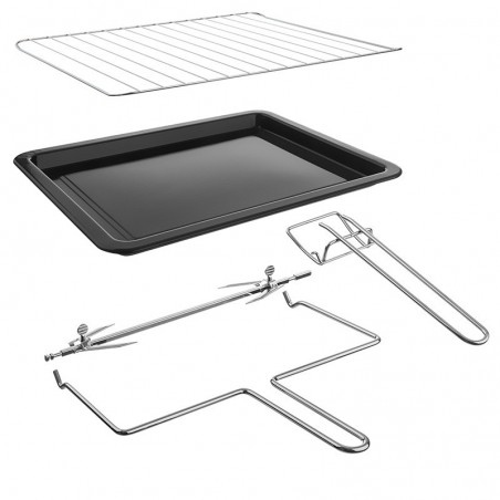 Komplektacijoje kartu rasite patogius aksesuarus kepimui: emaliuotą kepimo skardą, chromuotas kepimo groteles, žnyplės padėklui ištraukti. Šie priedai leis kepti įvairiausius patiekalus be didelių pastangų!
