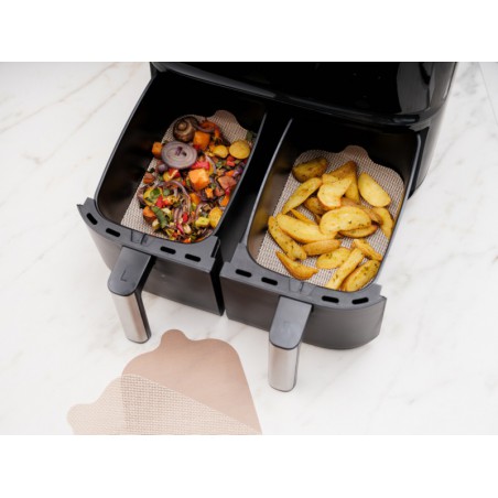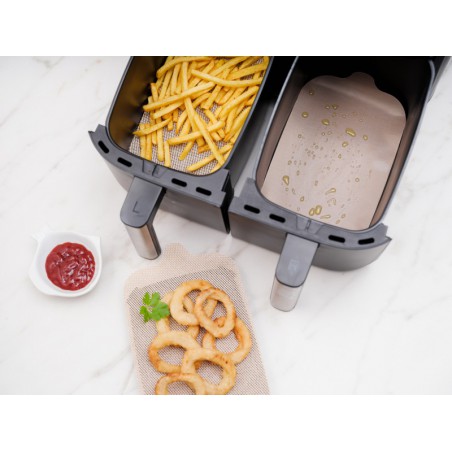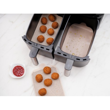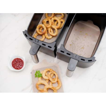 Kilimėliuose integruotos rankenos, kad juos būtų galima lengvai išimtgi iš karšto oro gruzdintuvės krepšelių;