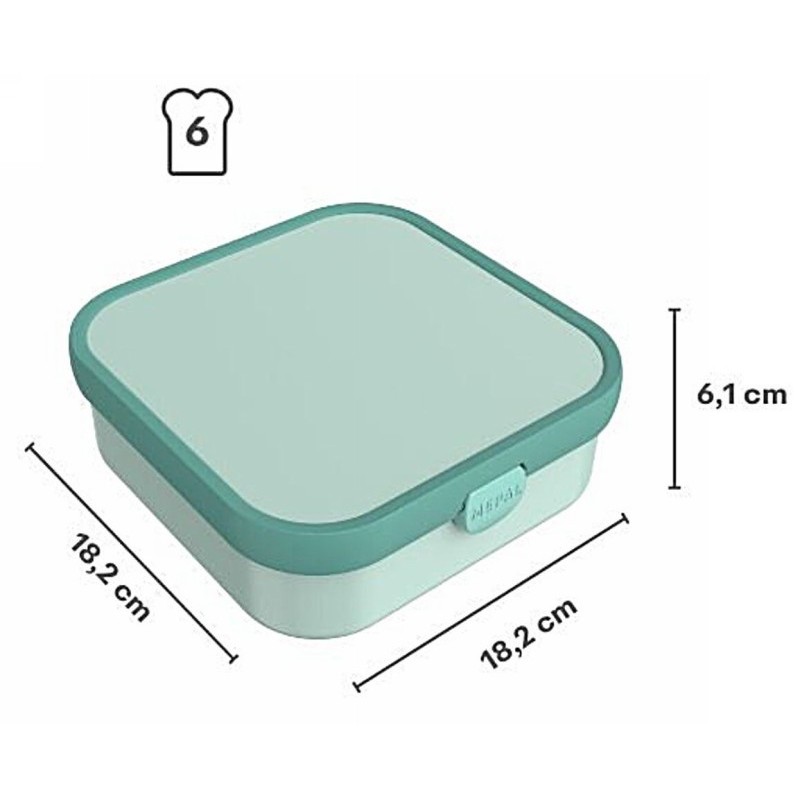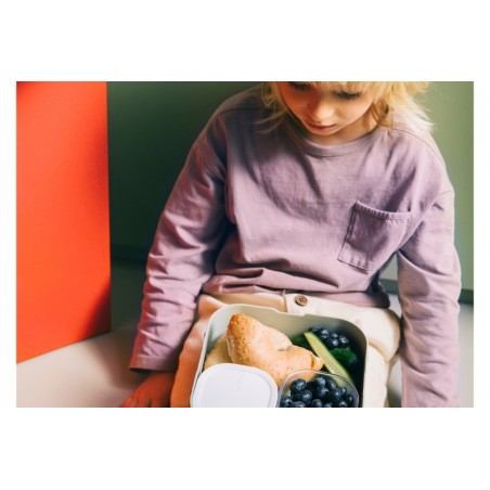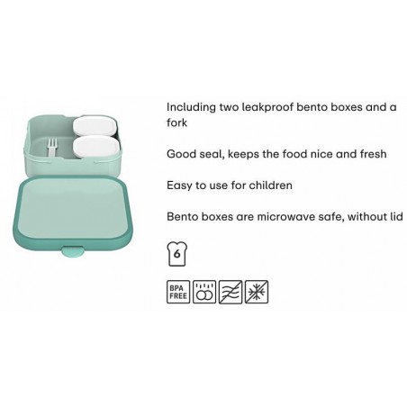 Dėžutė padalinta į dvi atskiras dalis, todėl visi produktai išlieka švieži ir nesusimaišo. Norite tik sumuštinių? Paprasčiausiai išimkite „bento“ indelius ir turėsite daug vietos. Po naudojimo tiek pagrindinę dėžutę, tiek indelius galima patogiai išplauti indaplovėje. Indeliai taip pat tinkami naudoti mikrobangų krosnelėje (be dangtelio).