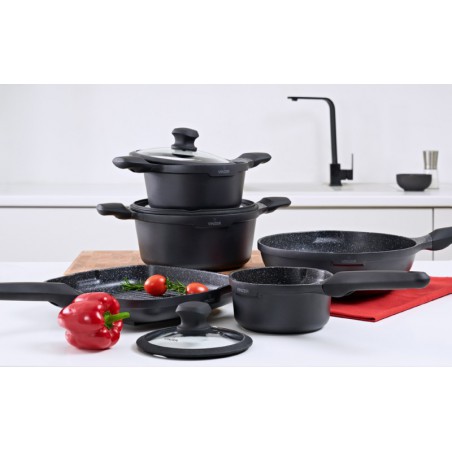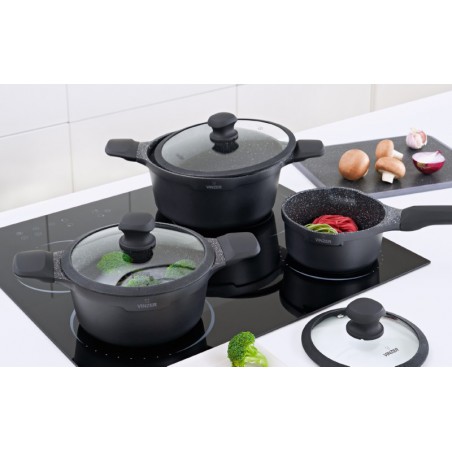 Indukcinis puodas su dangčiu Vinzer „Kuro“ yra pagamintas iš lieto aliuminio, o jo vidus padengtas nesvylančia ir nelimpančia trisluoksne „Greblon C3“ danga. Ši danga yra labiau atsparesnė įbrėžimams, lyginant su kitomis dangomis, todėl ji naudojama tik aukščiausios kokybės indams gaminti.