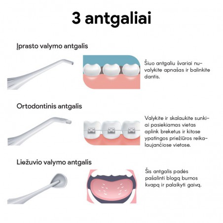 • Pridedami antgaliai: įprastas / ortodontinis / liežuvio valymo.