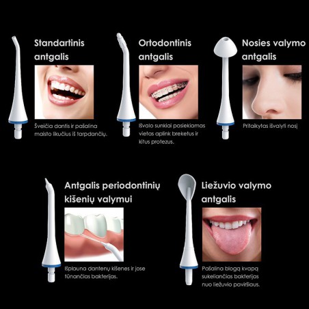 Prietaisas komplektuojamas kartu su 5 skirtingo funkcionalumo antgaliais, kurie užtikrins visapusį burnos irigatoriaus naudojimą.