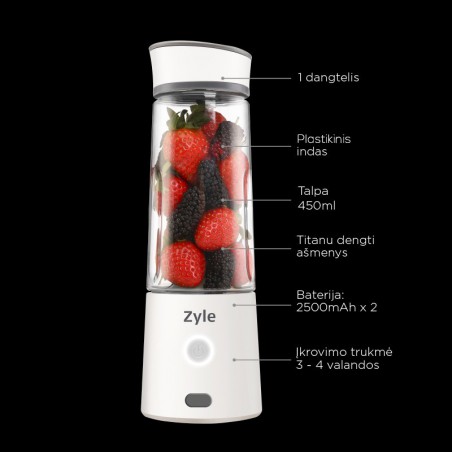 Su šia įkraunama „Zyle“ kokteiline savo mėgstamiausius glotnučius pasiruošite vos per kelias sekundes! Dėl išskirtinių titanu padengtų prietaiso ašmenų, ji efektyviai sutrins ir susmulkins įvairius ingredientus, ledukus bei šaldytus vaisius, kad Jūsų paruošti kokteiliai būtų tobulo skonio.