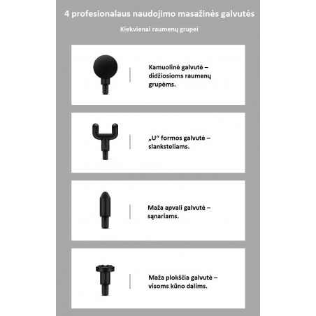 Pridedamos 4 pakaitinės masažinės galvutės, skirtos naudoti pagal skirtingas kūno sritis: