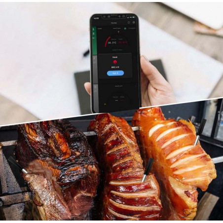 Išmanusis belaidis grilio termometras Jums bus nepamainomas pagalbininkas maisto ruošimo grilyje metu. Šis prietaisas yra specialiai sukurtas naudojimui su programėle, kurią turėsite įsidiegti savo telefone. Programėlė veikia tiek su iOS, tiek suAndroid operacinėmis sistemomis. Tiesiog pridėkite prietaisą prie ruošiamo maisto, pasirinkite ruošiamos mėsos rūšį ir kepimo temperatūrą, o įrenginys ir programėle atliks visa kita. Jums nebereikės nuolatos tikrinti ruošiamo maisto ir jaudintis dėl perkepimo, taigi tuo metu galėsite užsiimti kita, sau malonia veikla.