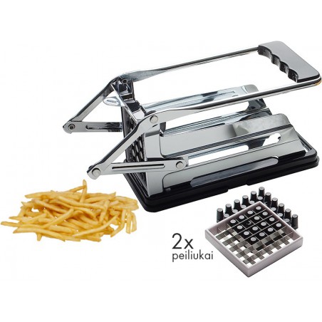Dėl dviejų skirtingo dydžių keičiamų ašmenų galėsite bulvytes supjaustyti tiek mažesniais, tiek ir didesniais gabaliukais. Guminis pjaustyklės pagrindas užtikrins stabilumą ir saugumą.