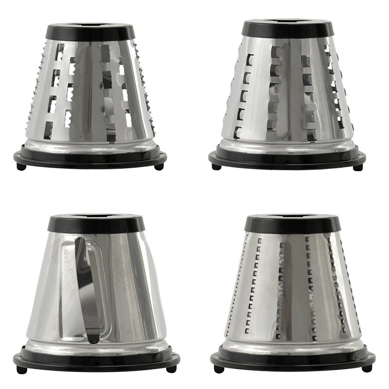- 4 nerūdijančio plieno ašmenys, skirti pjaustymui griežinėliais, tarkavimui bei smulkinimui;
