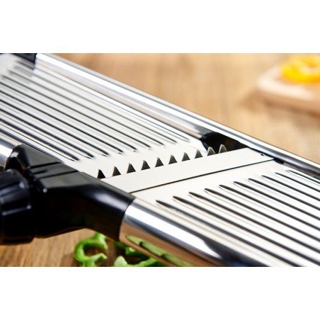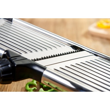Daržovių pjaustyklės dalys yra pagamintos iš medžiagų, tinkančių sąlyčiui su maistu. Peiliai ir konstrukcija yra nerūdijančio plieno, o gumuotos kojelės neslidžios, todėl pjaustymas bus saugus. Prie pjaustyklės pridedamas saugus laikiklis, kuris apsaugos jūsų pirštus ir leis tvirtai laikyti pjaustomą daržovę.