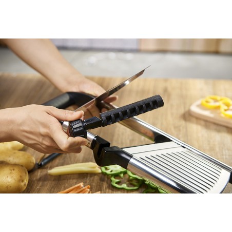 Ši funkcionali pjaustyklė leis jums rinktis pjaustomų griežinėlių storumą nuo popieriaus storio permatomų griežinėlių iki 9 mm dydžio. Taip pat galėsite pjaustyti 4,5 mm storio šiaudeliais ir 9 mm storio lazdelėmis. Griežinėlių ir šiaudelių dydį pasirinksite patogia pasukama rankenėle su nurodytais pjaustymo dydžiais.
