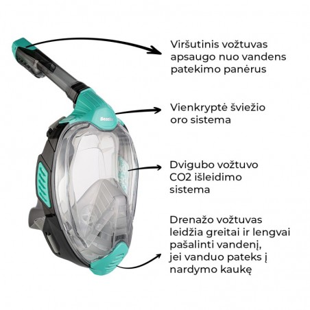 Panoraminė viso veido kaukė leis matyti puikų vaizdą, palyginti su standartine nardymo kauke, taip pat nardant lengviau nei bet kada ankščiau galėsite kvėpuoti pro burną ar nosį, tai greičiausias ir veiksmingiausias būdas, leidžiantis išvengti pakartotinio CO2 įkvėpimo problemos. Taigi nardymo metu bus tiekiama daug daugiau šviežio oro. Nardymo kaukė turi platų plokščią lęšį, kuris neiškraipo vaizdo ir užtikrina aiškų, nepertraukiamą 180 laipsnių vaizdą.