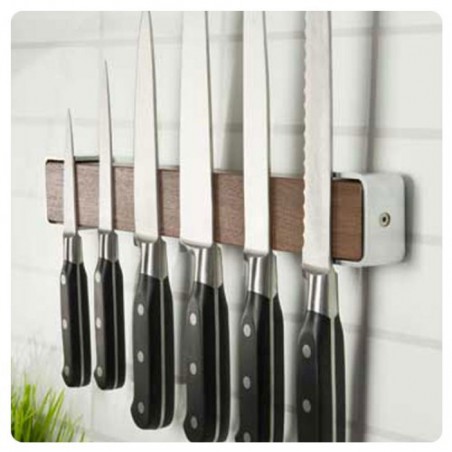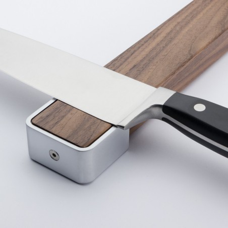Šis ergonomiškas magnetinis peilių laikiklis pagamintas iš natūralaus riešutmedžio. Susilietęs su jūsų peiliu, riešutmedžio paviršius ant peilio nepaliks jokių žymių.