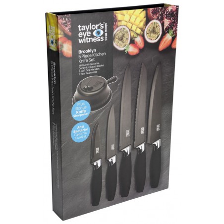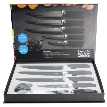 „Taylor’s Eye“ buvo įkurta 19 amžiaus pradžioje ir nuo to laiko, išlaikant savo senąsias tradicijas, jie gamina itin aukštos kokybės peilius. Visi žinome, kad skirtingiems maisto produktams pjaustyti reikalingi skirtingos paskirties peiliai, tačiau kartais nesusimastydami naudojame vieną ir tą patį peilį, tiek mėsai, tiek duonai, tiek daržovėms. Šis „Taylor’s Eye“ 5 skirtingų peilių rinkinys maisto ruošimą pavers tikru malonumu. O panaudoję peilius, juos susmeigsite į specialiai peiliams pritaikytą stovą.