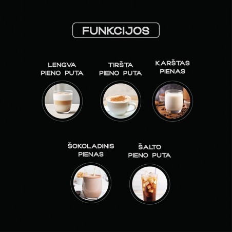 Pieno putų gamyba: sukurtas idealioms putoms gaminti, kai pieno kiekis siekia nuo 120 ml iki 300 ml. Puikiai tinka latte, cappuccino ar kitų kavos gėrimų paruošimui.
