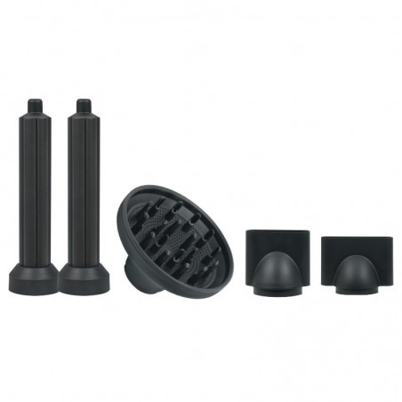 Rinkinyje: du koncentruoti plaukų džiovinimo antgaliai, difuzorius, du plaukų garbanojimo cilindrai