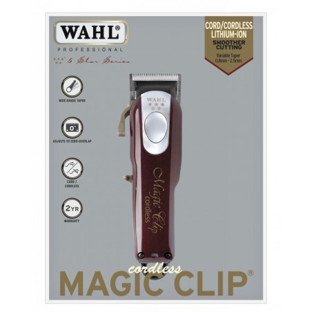 WAHL Professional „Magic Clip 5*“ – tai 5 žvaigždučių belaidė plaukų kirpimo mašinėlė, sukurta aukštos kokybės profesionaliam plaukų kirpimui. Mašinėlė išsiskiria lengvu, belaidžiu dizainu su įprastai galingu WAHL laidinių kirpimo mašinėlių kirpimo našumu, bei chromuotų peiliukų rinkiniu su „Crunch Blade“ technologija.