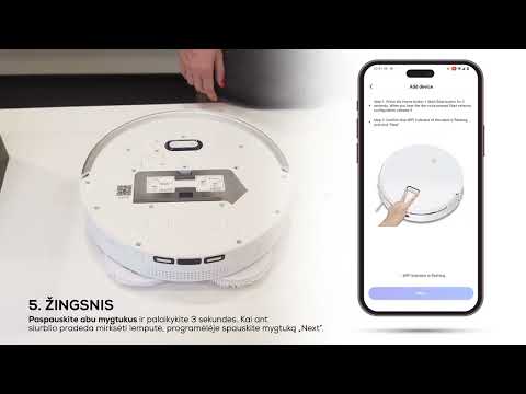 Ant roboto-siurblio paspauskite įjungimo ir namų mygtukus ir palaikykite juos 3 sekundes. Išgirsite „Start Network Configuration“, o wifi indikatorius pradės mirksėti. Tai parodo, kad prietaisas perėjo į wifi ryšio konfiguracijos režimą. Atidarykite mobiliąją programėlę ir paspauskite „+”, kad pridėtumėte naują prietaisą.
