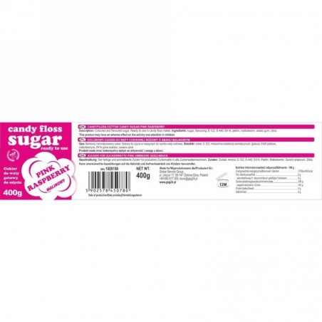 Spalvotas aviečių skonio cukrus skirtas naudoti cukraus vatos gaminimo aparatams, paruoštas naudojimui. Šis cukrus pasižymi stipriu aromatu, intensyvia spalva ir natūraliu skoniu. Patogi laikymui pakuotė, apsauganti produktą nuo drėgmės.