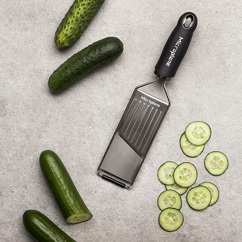 „Microplane Gourmet Slicer“ tiksliai pjausto agurkus, ridikėlius, cukinijas, bulves, svogūnus, paprikas, obuolius ir kitus ingredientus greitai, lengvai ir patogiai. Aštrus kaip skustuvas nerūdijančio plieno peilis užtikrina puikiai vienodus gabaliukus. Pjaustyklė yra lengvai naudojama ir valdoma dėl fiksuoto pjaustymo peilio, jos nereikia reguliuoti ar nustatyti. Ergonomiška minkšta rankena ir guminės kojelė užtikrina lankstų naudojimą.