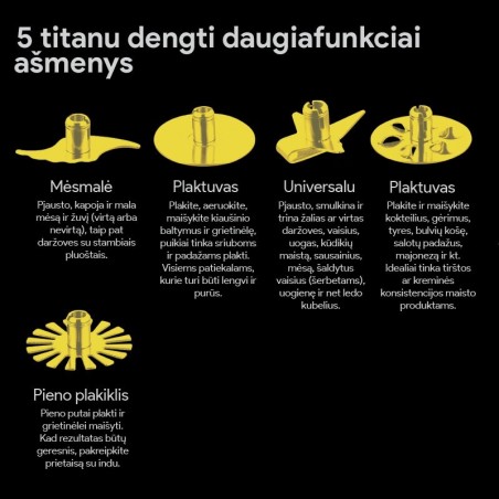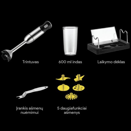 Dėka prietaiso komplektacijoje esančių 5 titanu dengtų daugiafunkcių ašmenų, su šiuo ergonomišku prietaisu lengvai ir greitai pagaminsite padažus, majonezą, trintas sriubas, kūdikių maistą, galėsite plakti kokteilius, išplakti pieno putą bei grietinėlę bei naudojantis mėsmalės funkcija sumalti mėsą ir žuvį. O visus komplektacijoje esančius priedus galėsite patogiai laikyti specialiame priedų laikymo dėkle, kuris neabejotinai papuoš Jūsų virtuvę.