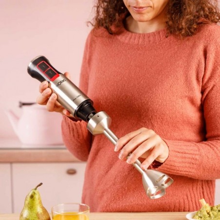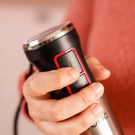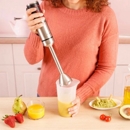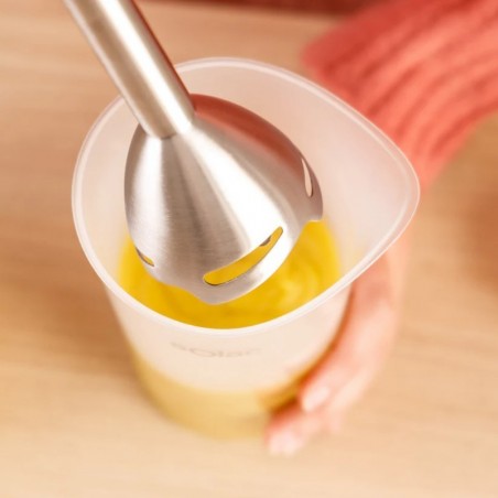 Su šiuo Solac „Pro Chef“ rankiniu maisto trintuvu greitai pasigaminsite savo mėgstamus patiekalus ir pradžiuginsite savo šeimos narius. Dėl su prietaisu komplektuojamų smulkinimo indelio ir plakimo šluotelės galėsite ruošti ne tik padažus, piurė, kremus, bet ir smulkinti daržoves bei mėsą ar plakti kiaušinių baltymus ir grietinėlę. Visa tai atliksite itin greitai ir paprastai. Galingas prietaisas taip pat tiks net kiečiausiems produktams smulkinti.