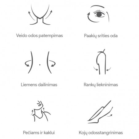 • Prietaisą galima naudoti kaklo, rankų, krūtinės, liemens bei kojų masažui, siekiant suteikti odai stangrumo ir sutvirtinti kūno raumenis;