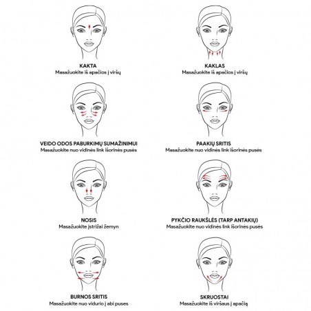 Galima naudoti bet kokiai veido odos sričiai: kaktai, kaklui, nosiai, burnos sričiai, skruostams bei jautriai paakių zonai;