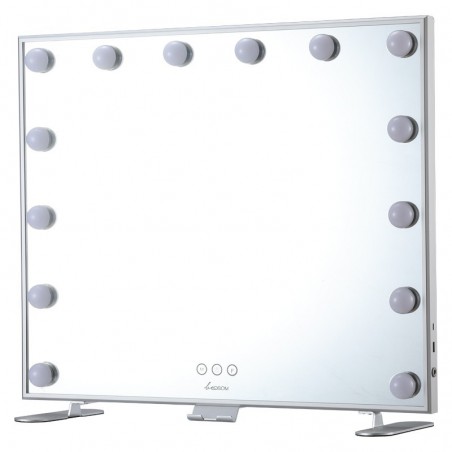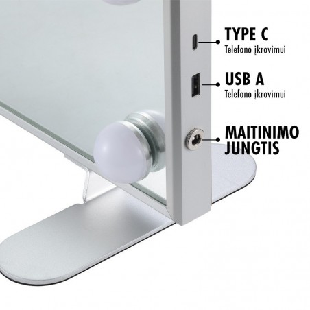 Didelis „Be Osom“ veidrodis su 14 LED lempučių apšvietimu, galimybe rinktis apšvietimo spalvą ir pritemdymo lygmenį. Lengvas valdymas 3 mygtukais. Maitinimas pridedamu laidu. Veidrodis turi tvirtinamas kojeles pastatymui arba veidrodį galima pakabinti už tam skirtų pakabinimo angų. Veidrodis turi USB A ir C jungtis telefono įkrovimui.