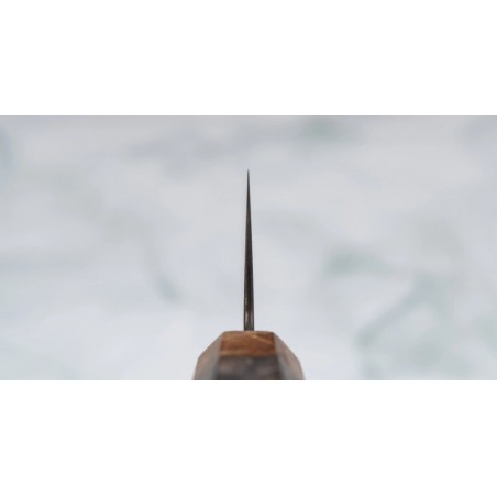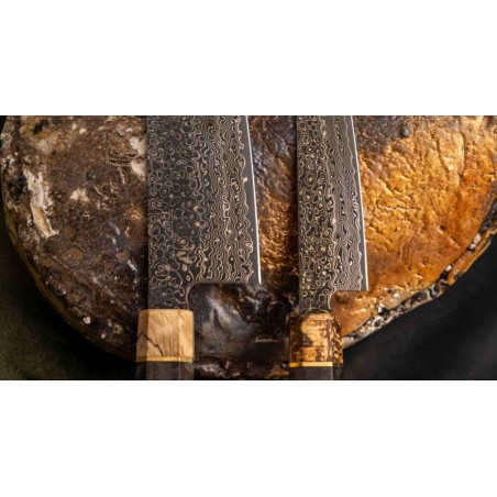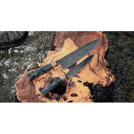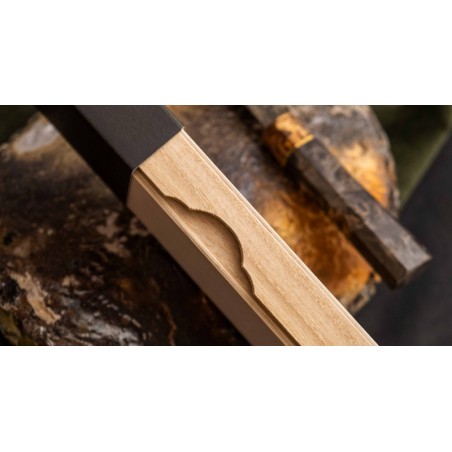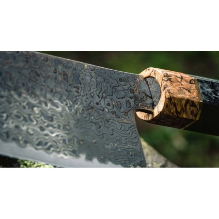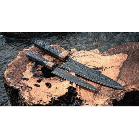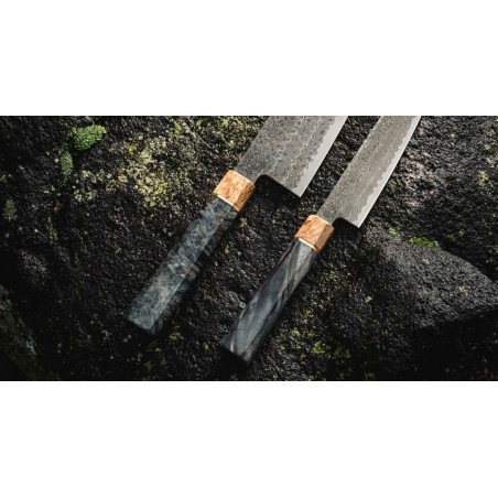 Peilis turi tradicinę japonišką aštuonkampę rankeną, pagamintą iš stabilizuotos medienos, su ypatingu žiedu, pagamintu iš 300 metų senumo švento ąžuolo medienos.