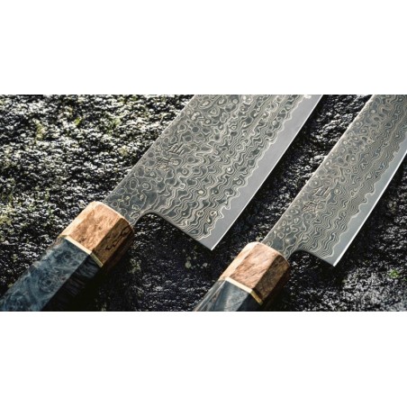 „Senzo Dawn Limited Edition Gyuto SG2 200 mm (7,9 col.)“ – universalus japoniškas peilis, pagamintas Japonijos „Suncraft“ kalvėje. Ašmenys iškalti naudojant tradicinį sluoksniavimo metodą, vadinamą san-mai („sumuštinis“); SG2 miltelinio plieno šerdis yra apgaubta minkštesnio plieno sluoksniais, kurie sukuria įspūdingą juodą damasko raštą su auksiniu atspalviu. Peilis yra grūdintas iki maždaug 62–63 HRC, o tai reiškia, kad jis ilgai išliks aštrus. Plieno sudėtis ir mikrostruktūra užtikrina itin tikslų ir lygų aštrumą.