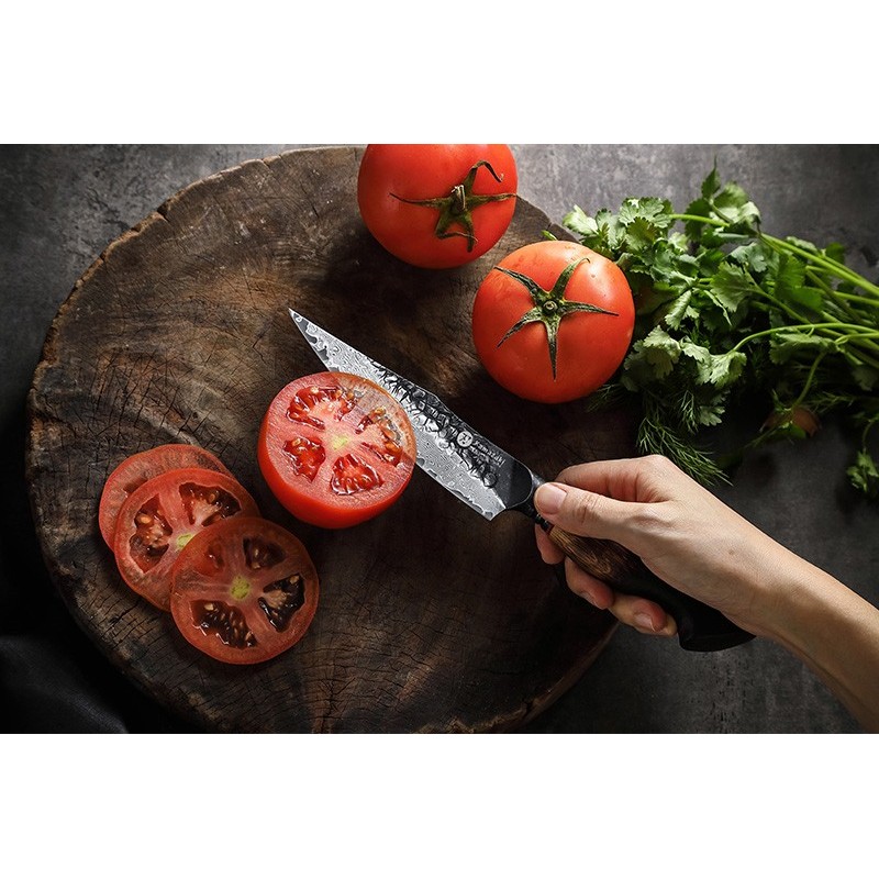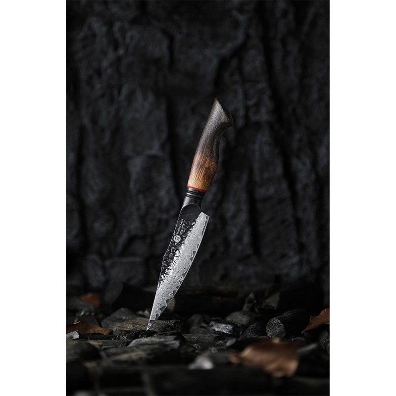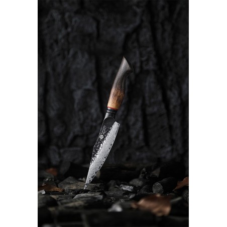 - Peilio ašmenys pagaminti iš 67 sluoksnių juodojo Damasko plieno;
