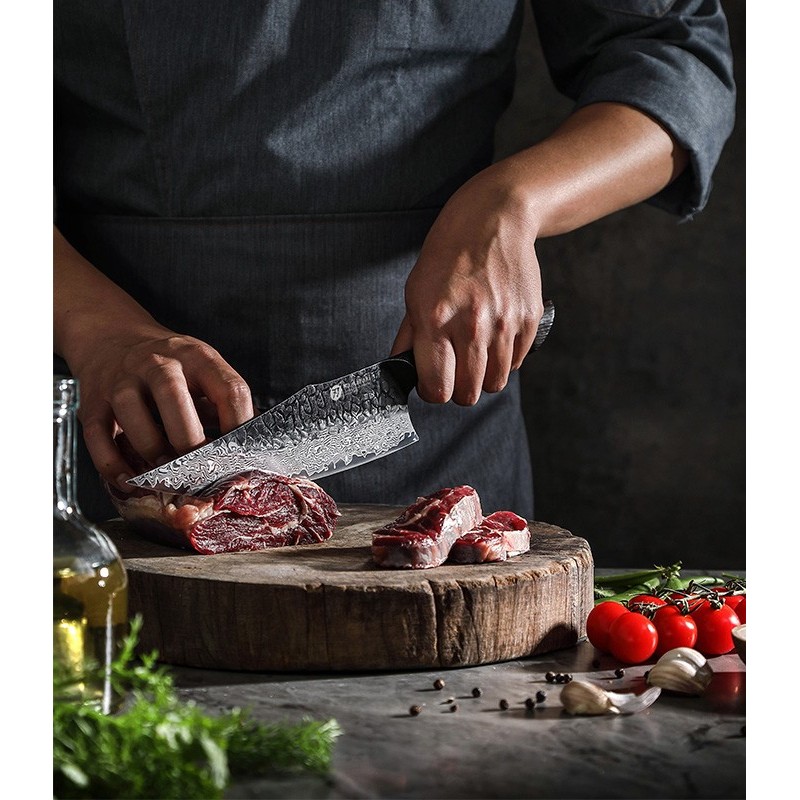 - Peilio ašmenys pagaminti iš 67 sluoksnių juodojo Damasko plieno;